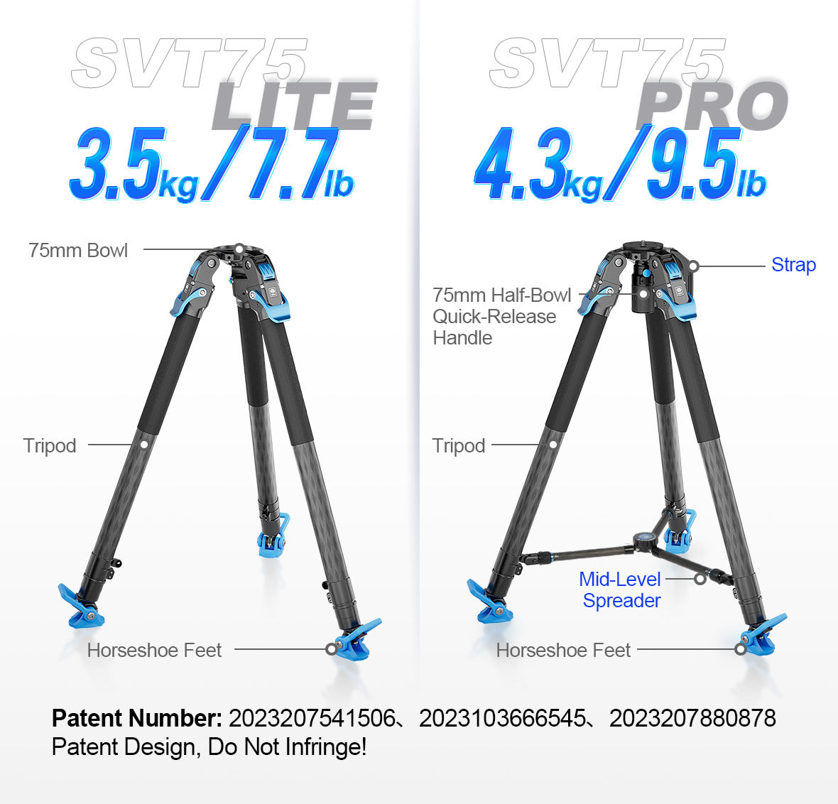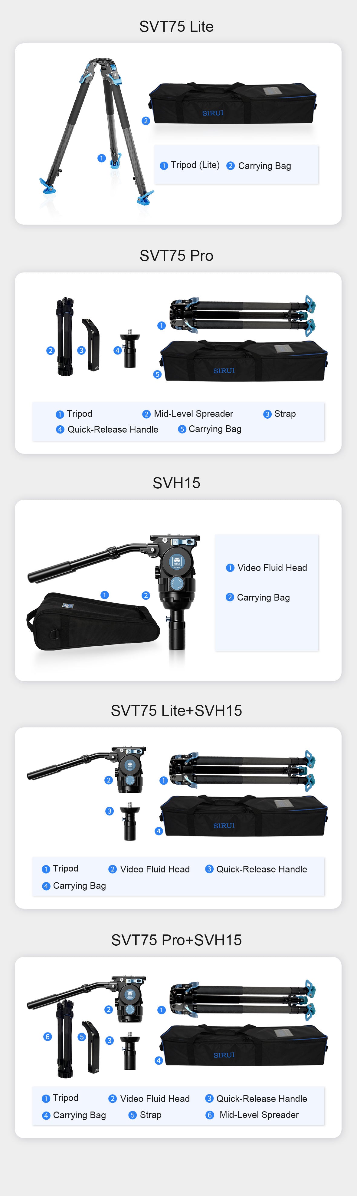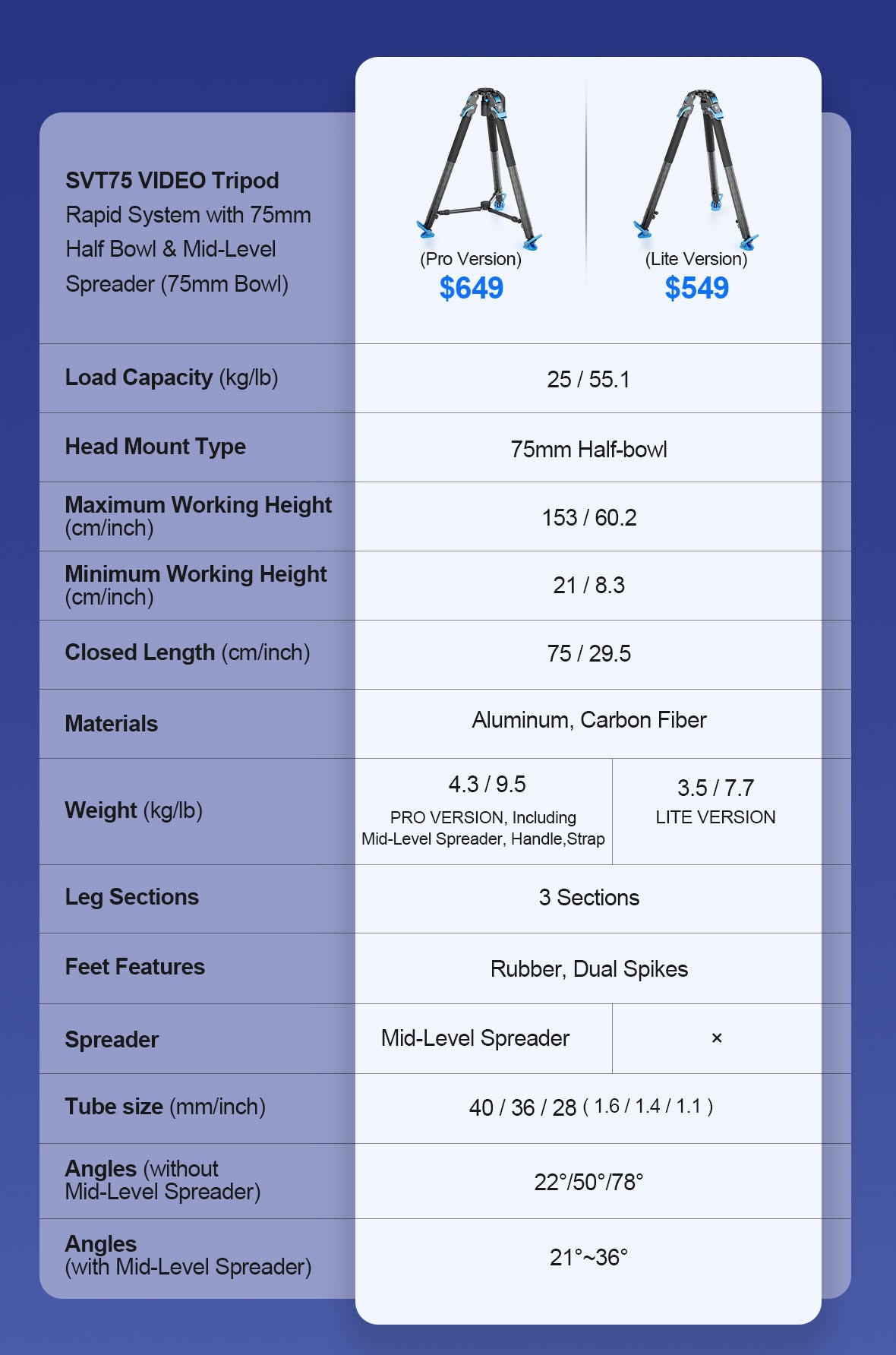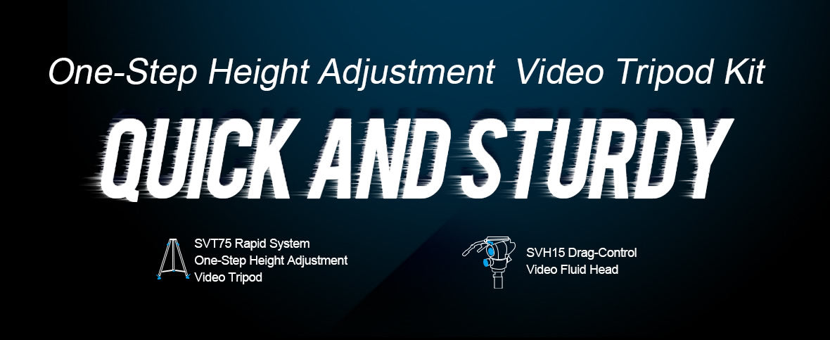 이 견고한 원스텝 높이 조절 비디오 삼각대는 SVT75 Lite와 SVT75 Pro 두 가지 버전이 있습니다.
