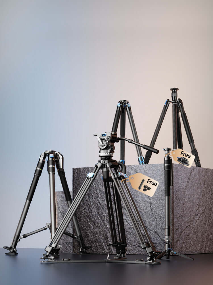 Tripods are essential tools for photographers and videographers, providing stability and support to capture clear and sharp images or videos. They are used in various scenarios, such as long-exposure photography, low-light conditions, self-portraits, time-lapse photography and shooting videos with smooth pans and tilts. Professional tripods ensure camera stability, reducing camera shake and allowing for precise framing.